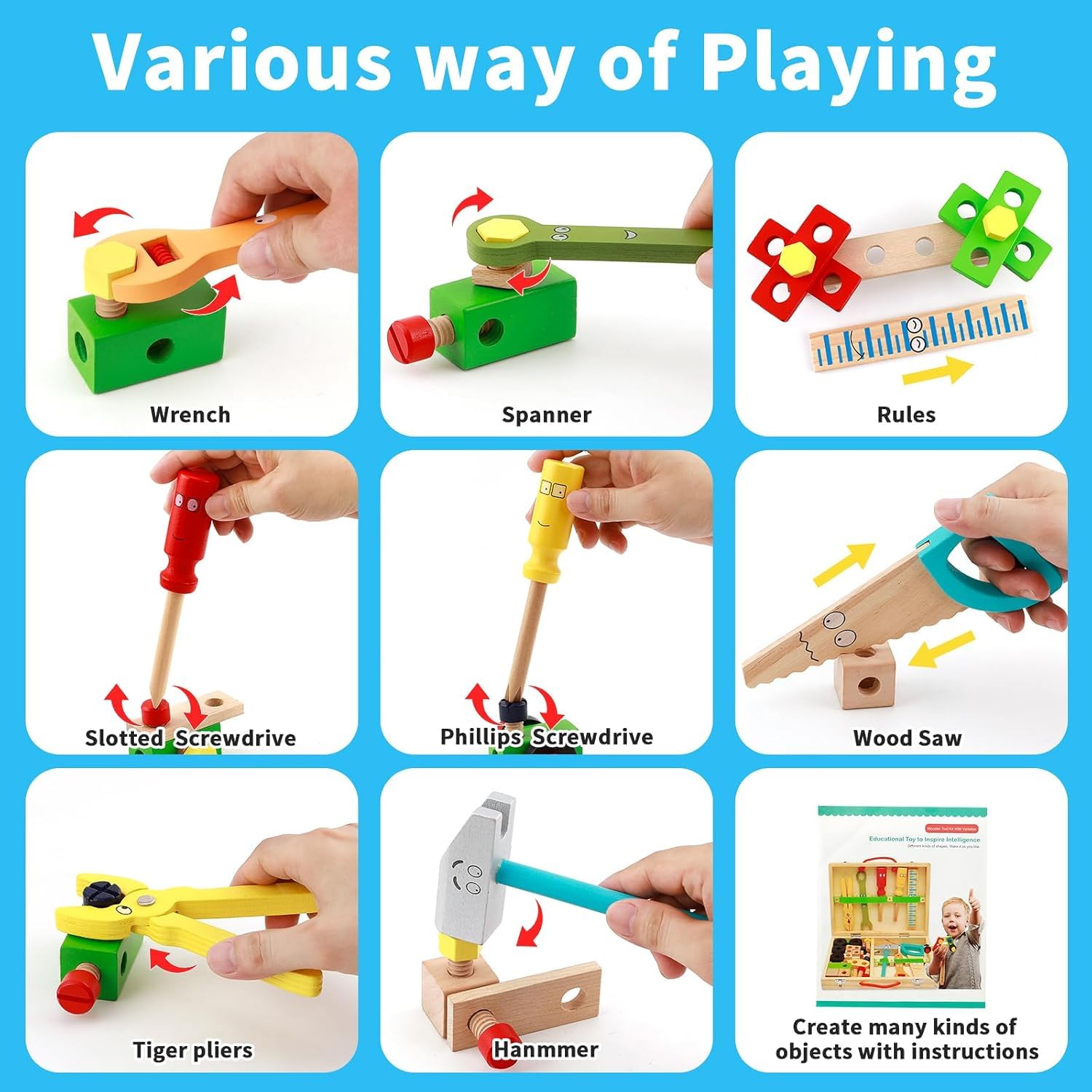 - COMPREHENSIVE SET: Complete wooden tool kit featuring hammers, screwdrivers, saws, rulers, nuts, bolts and various construction accessories in vibrant colours, all stored in a sturdy wooden box